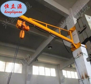 墻壁式旋臂起重機(jī)是根據(jù)用戶需要設(shè)計(jì)的專用起重設(shè)備。具有結(jié)構(gòu)新穎、合理、簡(jiǎn)單、操作使用方便、回轉(zhuǎn)靈活、自重輕、載荷移動(dòng)靈活等優(yōu)點(diǎn),是節(jié)能的物料吊運(yùn)裝備。可廣泛利用于廠礦、車(chē)間的生產(chǎn)線、裝配線和機(jī)床的上下活及倉(cāng)庫(kù)、碼頭等場(chǎng)合的重物吊運(yùn)。墻壁式旋臂起重機(jī)(墻壁吊)由支架、旋臂裝置及環(huán)鏈電動(dòng)葫蘆等組成。懸臂固定在墻壁或水泥柱上,可根據(jù)用戶需求進(jìn)行回轉(zhuǎn)。回轉(zhuǎn)部分分為手動(dòng)回轉(zhuǎn)和電動(dòng)回轉(zhuǎn)。環(huán)鏈電動(dòng)葫蘆安裝在懸臂軌道上,用于起吊重物。本機(jī)主要由:懸臂、回轉(zhuǎn)裝置、環(huán)鏈電動(dòng)葫蘆組成。環(huán)鏈電動(dòng)葫蘆有起重和在橫梁上往復(fù)運(yùn)行的功能。懸臂梁可由回轉(zhuǎn)裝置上的的減速機(jī)帶動(dòng)滾輪進(jìn)行回轉(zhuǎn)運(yùn)動(dòng)。電器控制箱安裝在環(huán)鏈葫蘆上。本機(jī)操作通過(guò)手電門(mén)按鈕實(shí)現(xiàn)。手電門(mén)有八個(gè)按鈕,分別控制快升、快降、慢升、慢降、左右回轉(zhuǎn)及葫蘆小車(chē)的水平前后行走。
